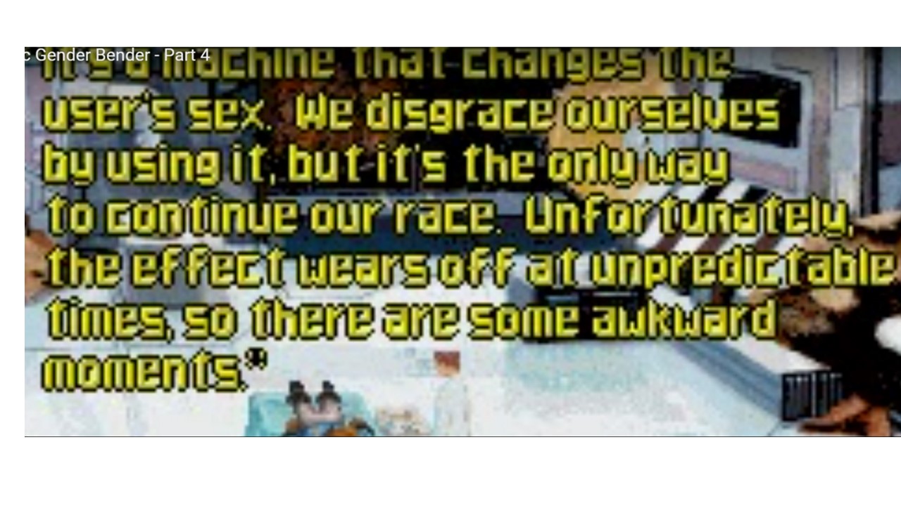 The Cosmic Gender Bender is a machine developed by the women of the planet that Rex has crashed on in the game. It allows the Keepers to change into biological men for short periods of time so they may impregnate the Stock women. This is described as “unpleasant” for the women, however, and because it “wears off at unpredictable times” there are apparently “awkward moments” (image below). Moreover, the Stock women don’t think much of the “transmorphs” who have used the Gender Bender. The scene showing this backstory can be viewed here.