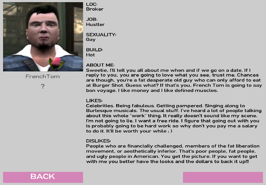 Tom Rivas, also known as French Tom (it is unclear why, the character is Puerto Rican), is a minor character in Grand Theft Auto IV. He is openly gay and owes Brucie money. In a quest called “Out of the Closet,” the player-character Niko is tasked with killing Tom on behalf of Roman and Brucie. He must first use a dating website to lure Tom into going on a date with him. When Niko meets Tom at a diner, they speak briefly before Niko shoots him. A video of the mission is available here (content warning: abelism and fat phobia). Tom’s police record also indicates he has been arrested for being a sex worker. His love-meet.net profile appears below.