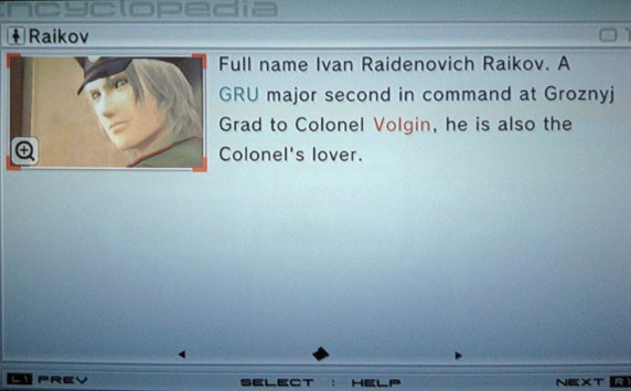 Major Raikov first appeared in Metal Gear Solid 3 and, as the screen shot above shows, is the lover of Colonel Volgin (his commanding officer). Raikov is said to be a parody of Raiden (see here and here), and (unlike Raiden) is represented as explicitly gay. Although his sexuality is not actually stated, Raikov does seem to be intentionally coded as a gay character. For example, heterosexual pornography that can be used to stun most enemy NPCs has no effect on him. He is also often portrayed as wearing thong underwear with Volgin’s symbol, a lightening bolt, in the video on this page.