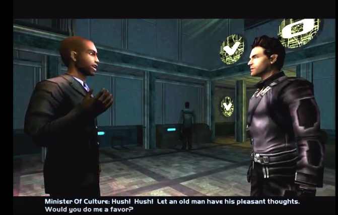 Deus Ex: Invisible War is a first-person cyberpunk RPG in which the player navigates a post-apocalyptic world being fought over by various political factions. The protagonist Alex Denton may be either male or female, with three different skin tone options depending on the player’s choice. During the Club Vox arc (if the male gender option is chosen), Alex is flirted with by Mark Finley who is the current Seattle Minster for Culture.