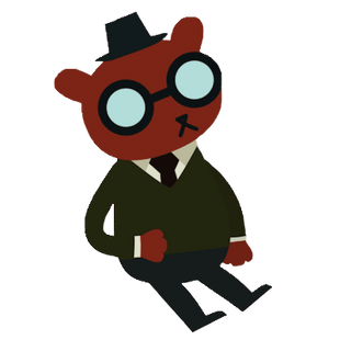 Angus is a bear-like character in the 2017 adventure game Night in the Woods. He works at Possum Springs’ video store, Video Outpost Too. He has a dry sense of humor and puts his faith in science and observable truths. He is in a committed relationship with Gregg, who he credits with “saving” him from his history of familial abuse. Greg and Angus share an apartment together near the center of town.