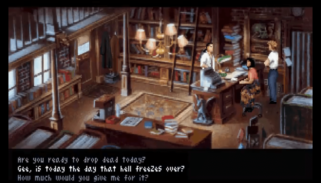 In Gabriel Knight: Sins of the Father, Bruno is the owner of a flower shop near Gabriel’s bookstore. He isn’t explicitly described as gay in the game, but (in the words of flamedrake of the Let’s Play Archive) he’s depicted as “an artificial construct of every gay stereotype known to man.” One wiki entry describes him as “a bit of a hippy, takes flower power a bit too literally perhaps.” In the novelization of the game, he is explicitly gay: “Bruno was gay, which was fine, but he was also a flaming bitch, which was not.” Later in the game Bruno mentions a man named Cid, who never appears but is implied to be his boyfriend (Cid does not appear to be mentioned in the novel either).