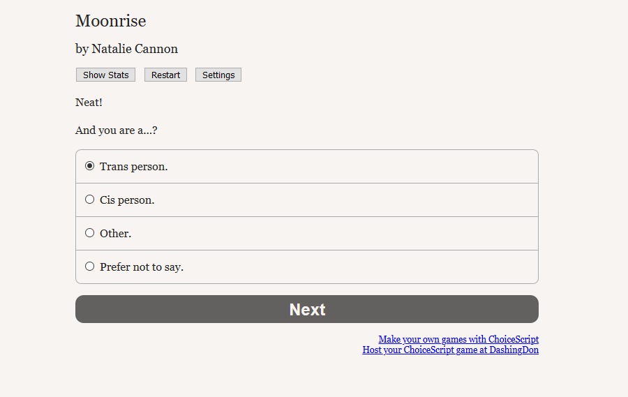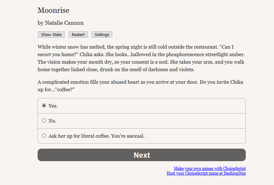 - Cannon, N. (n.d.). Moonrise. Retrieved from https://www.choiceofgames.com/user-contributed/moonrise/#utm_medium=web&utm_source=ourgames