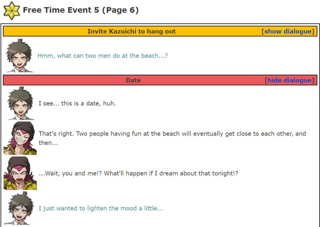 - Free Time Events/Kazuichi Soda. (n.d.). Retrieved January 29, 2020, from https://danganronpa.fandom.com/wiki/Free_Time_Events/Kazuichi_Soda#Page%205