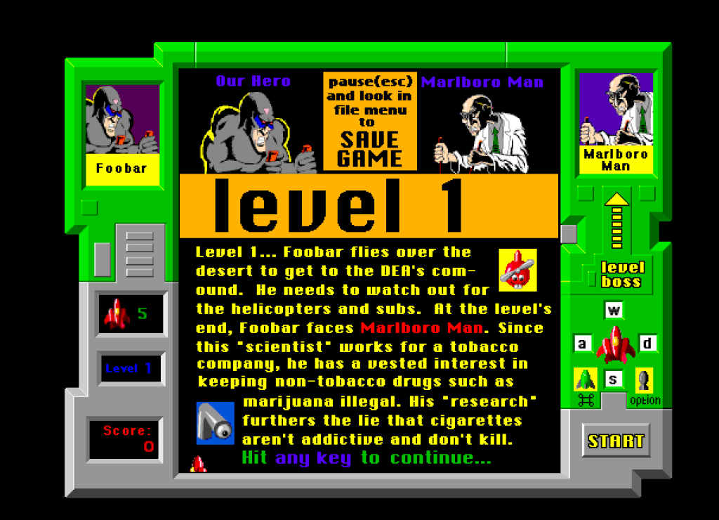 In the original game, Foobar is on a mission to save his boyfriend Ned who has been captured by the DEA (the US Drug Enforcement Agency). Although we did find several reviews and posts that merely referred to Ned as Foobar’s friend or “friend” (see here, here), the game very clearly refers to them as boyfriends. In addition, there are some gay coded references in the imagery of the game, including: a pink triangle on the forehead of Foobar’s mask and as the targeting site; “yummies” (or power ups) such as rainbow flag for an extra life or a condom (with an American flag) as the protective shield. According to Richard Cross’s emails the pro-gay rights, anti-war on drugs and anti-censorship politics were very intentional in the games.