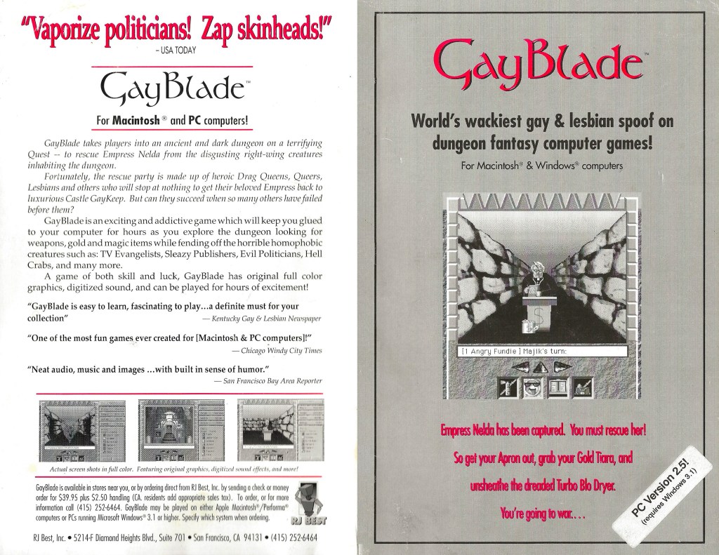 GayBlade was a role-playing game developed by Ryan Best in 1992. According to the manual: “GayBlade takes players into an ancient and dark dungeon on a terrifying Quest—to rescue Empress Nelda from the disgusting right-wing creatures inhabiting the dungeon. Fortunately, the rescue party is made up of heroic Drag Queens, Queers, Lesbians, and others who will stop at nothing to get their beloved Empress back to luxurious Castle GayKeep. But can they succeed when so many others have failed before them?”