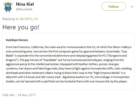 Best’s press kit for the game also includes additional articles and a clipping from Australia’s Sydney Star Observer (GayBlade press kit). The game was even accused by one pro-life activist website as being part of the “homosexual agenda” (see page 21, about halfway through the page).